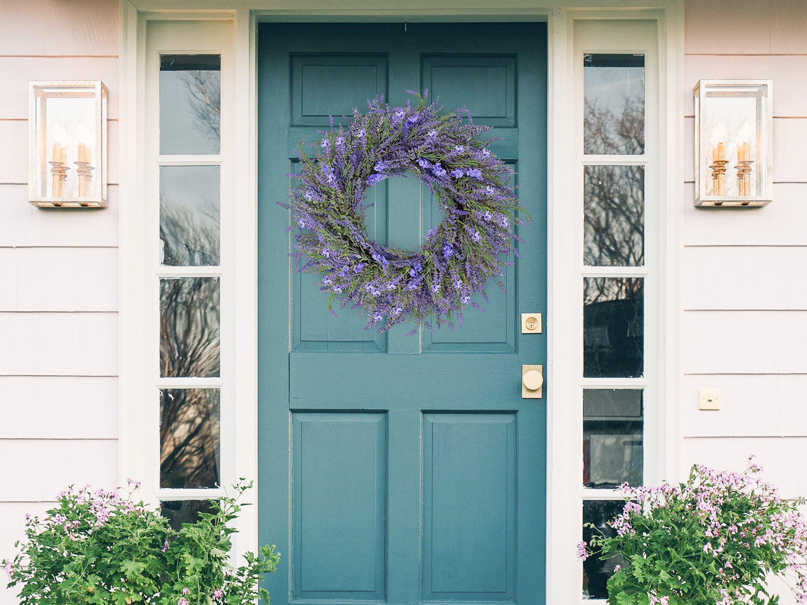 With soft purple blooms and lifelike greenery, it’s a beautiful accent for doors, walls, or mantels, perfect for adding a touch of serenity all year long.